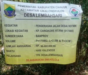 “Alhamdulillah kegiatan pengerasan jalan/hotmix jalan desa dari bantuan provinsi telah direalisasikan. Lokasinya di kampung Cangkore dengan volume panjang 179 M, Lebar 2.5 M dan tinggi 3 CM, ” ungkap Cecep.